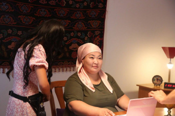 Бегимай Турусбекова тасмага тартылууда. Сүрөт